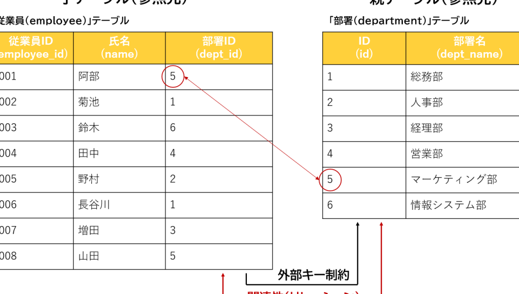 外部キー(FOREIGN KEY)は、関係データベース管理システム(RDBMS)において、複数のテーブルの関連を定義するために使用されるキーのことです。外部キーを設定することで、異なるテーブル間に存在する関係を明確化し、データの整合性を維持することができます。