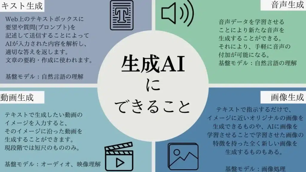 生成AIは、タスクや機能によって分類することができます。例えば、画像生成AI、自然言語処理AI、ゲームAIなど、生成AIが果たすタスクに基づいて分類することができます。