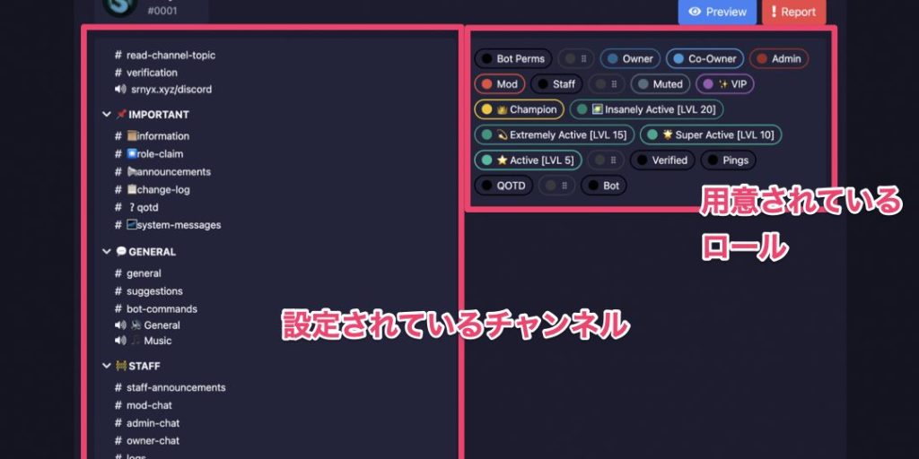 - サーバーステータスの表示:サーバーのステータスを、オンライン人数やチャンネル数などを表示することができます。
